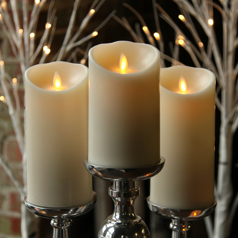 The Ivory 3.5 inch x 5 inch Moving Flame Pillar candle provides a beautiful, warm glow to any room. To our eye, there are no comparable flameless candle made that are as realistic. Your Moving Flame candle is made from paraffin wax, provides a lovely, mild scent, and comes with a 5-hour built-in timer and remote ready capabilities. In addition, every set of 2 āDā batteries will have our candle brightening your home for 700 hours.